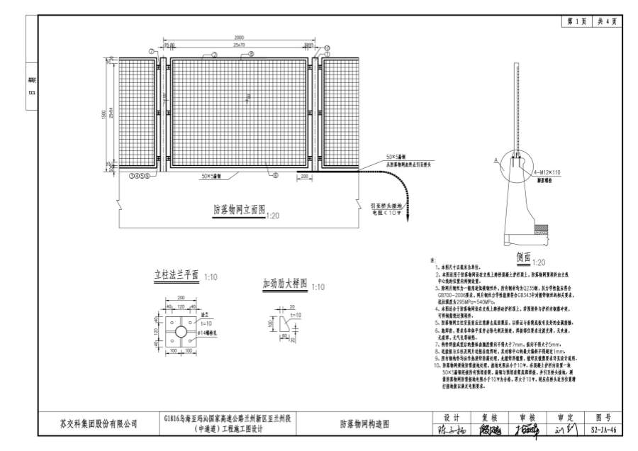 4、本图适合于防落物网设在支线上跨桥护栏顶上,若预埋件与护栏内钢筋冲突,可将钢筋绕过预埋件。