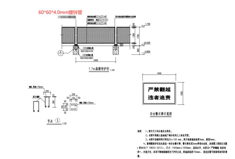4、新增隔离护栏处悬挂一块安全警示牌,警示牌采用3mm厚铝合金板,表面覆工程级反光膜(符合GB/T 18833-2012)。尺寸:1400mmx1000mm,蓝底白字,内容为“ 严禁翻越 违者追责”。安装方式:采用不锈钢抱箍固定于护栏立柱,距地面高度700mm, 悬挂位置可根据现场实际调整。