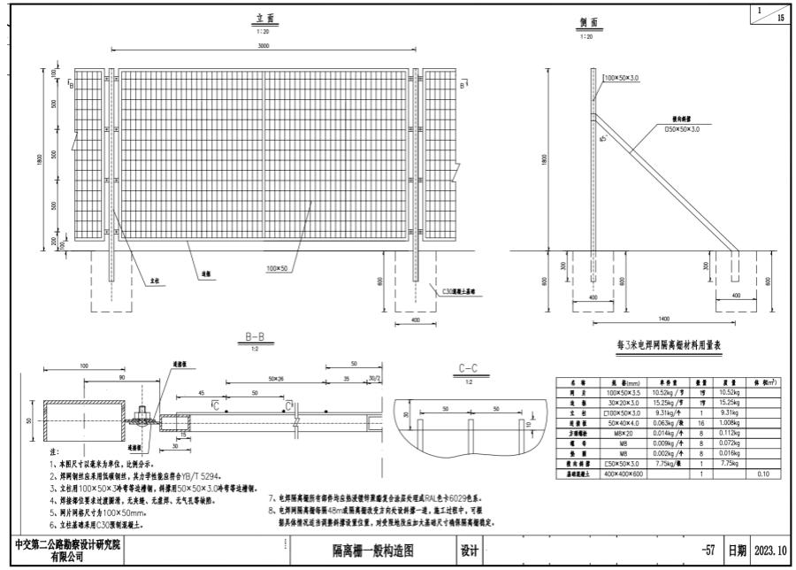 8、电焊网隔离栅每隔48m或隔离栅改变方向处设斜撑一道,施工过程中,可根据具体情况适当调整斜撑设置位置,对受限地段应加大基础尺寸确保隔离栅稳定。