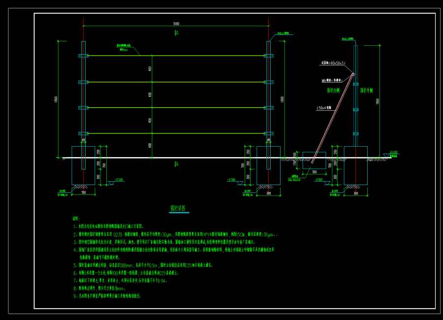 5、围栏基础采用灌注短桩,钻孔直径300mm,孔深不小于0.5m,围栏立柱就位后采用C25细石混凝土灌孔。