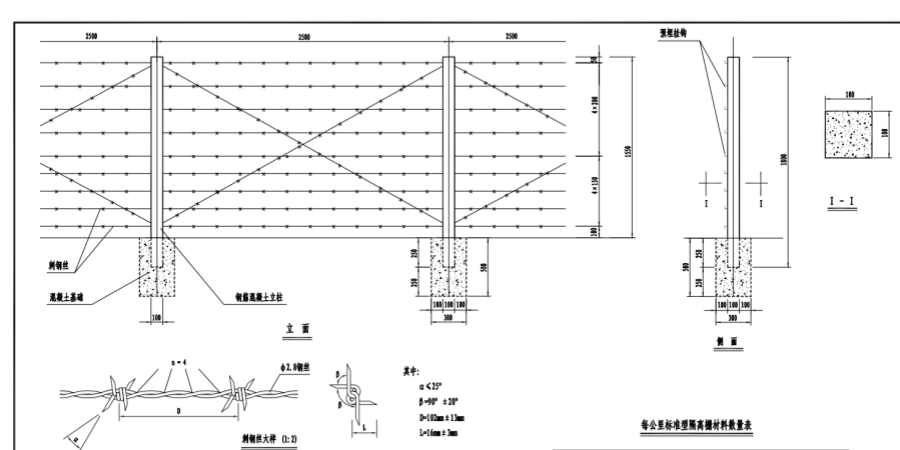 2.直线段每隔20m设置砼基础Ⅱ (300x 400 x 500);每隔50m设置砼基础Ⅲ (400x 400 x 500);每隔100m设置砼基础IV (400x500x600)。