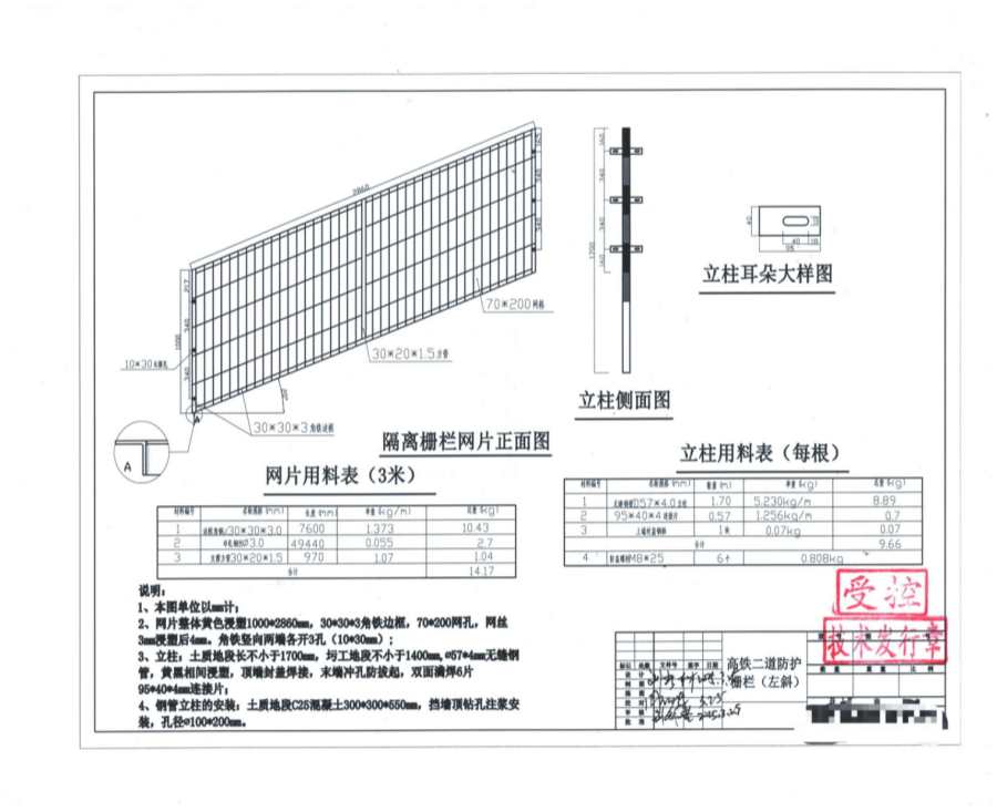 2、网片整体黄色漫塑1000*2860mm,30*30*3角铁边框,70*200网孔,网丝3mm漫塑后4mm。角铁竖向两端各开3孔(10*30mm)。
