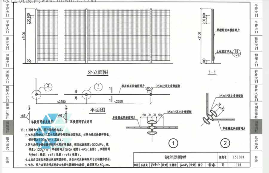 3.网片采用冷拔热镀锌钢丝电阻熔焊制成,钢丝抗拉强度>500MPa,镀锌量>120g/㎡;单横筋网片为φ5(横筋)+φ5(坚筋);双横筋网片为φ6(横筋)+φ5(竖筋)+φ6(横筋)。