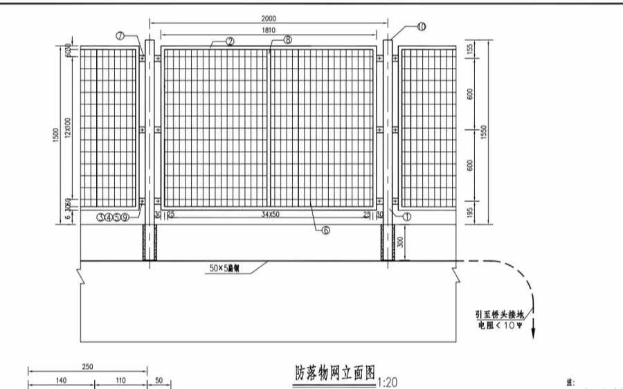 1.防落网须做防雷接地处理,接地电阻应小于10欧姆。在混凝上护栏内设置一块50x5扁钢连接所有预埋套筒,扁钢与预埋套简底部焊接,并引至桥头接地。测量防落网防雷接地电阻小于10欧姆为合格,若大于10欧姆,则应在桥墩适当位置增打接地极以满足电阻要求。