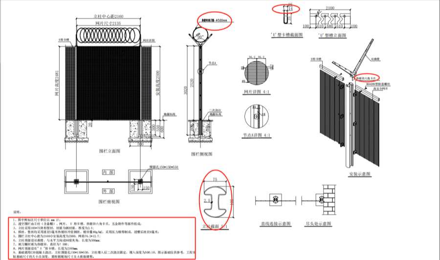 2.5m 高钢格栅围栏由立柱(含盖帽)、网片、U 形卡槽、镀锌钢六角卡爪、五金附件等部件成:立柱采用105×75 异形型材,材质为镀锌钢,厚度为2.5mm(喷涂前需保证钢材厚度不小于 2.3mm-2.4mm),横丝、竖丝采用聚酯侵塑后直径4mm(浸塑前需保证丝径不小于 3mm),颜色为绿色。热镀锌冷拔钢丝,镀锌量≥40g/㎡ ,采用压力熔焊制成。围栏立柱中心距为 2160mm,安装高度为2500mm,网格为 76.2*12.7mm,立柱顶部设双曲臂,与水平方向成90 °夹角,长度为 566mm,表面热镀锌,镀锌量>275g/㎡ ,刺刀圈材质为热镀锌钢,直径为φ500mm。U 形卡槽材质为镀锌钢 ,壁厚为1.0mm,做喷塑处理。