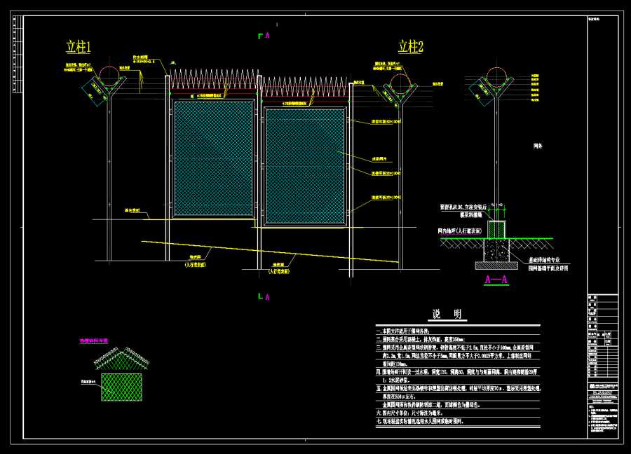 三、围网采用金属菱型网状钢管架,钢管高度不低于2.5m,直径不小于100mm,金属菱型网高2.2m,宽1.5m,网丝直径不小于5mm,网眼见方不大于0.0025平方米。上部刺丝网每根间距100mm。