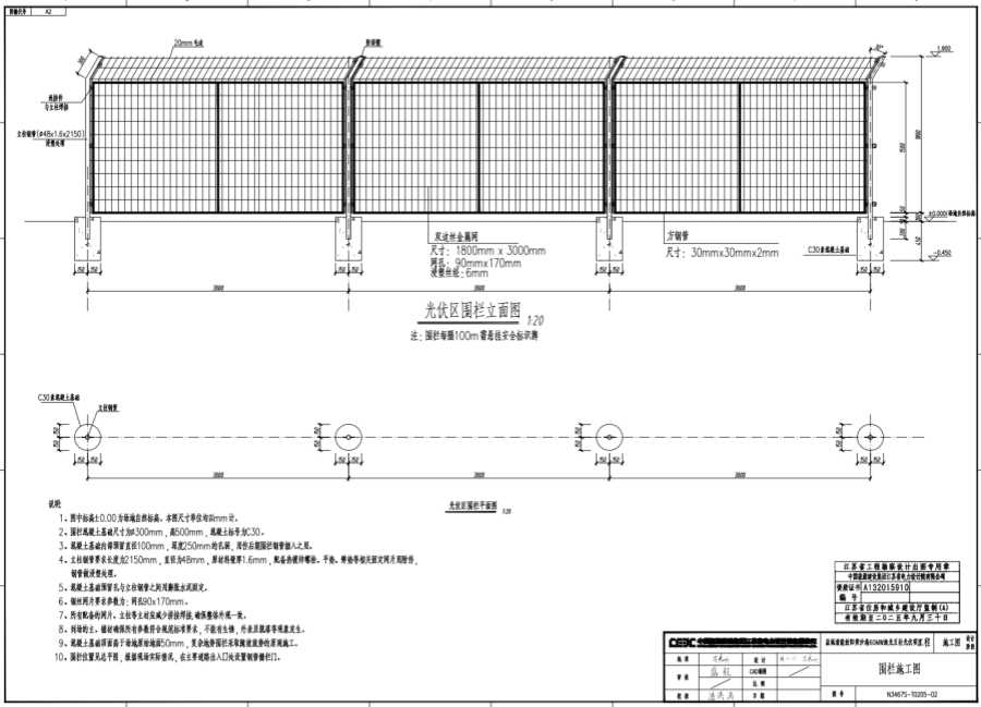 2、围栏混凝土基础尺寸为φ300mm,高500mm,混凝土标号为C30。