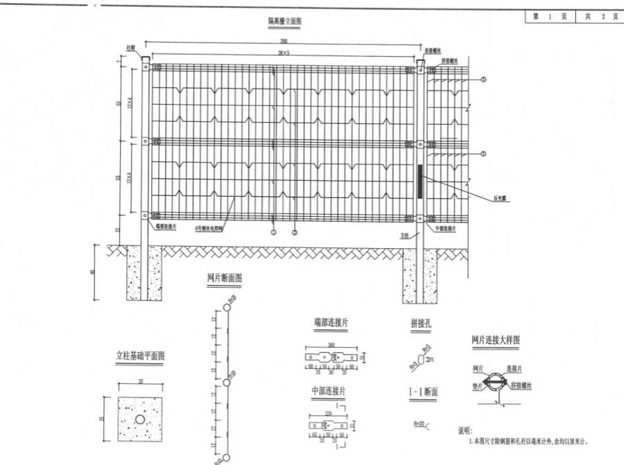 2.数量表中除钢丝以两米计外,其他数量为单根立柱数量,在同一结构段内应增加一根立柱。且增加四件端部连接片,减少四件中部连接片。