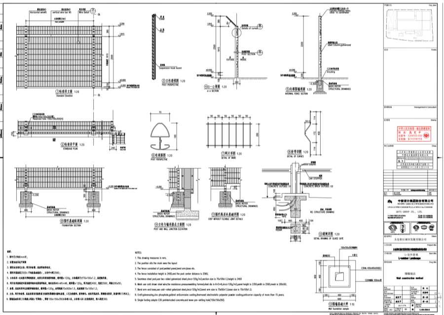 9.围墙基础采用C30混凝土现浇(可预制),预留150x150x350立柱埋入孔,立柱埋入后二次浇筑固定,埋入深度300。