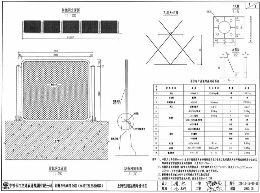 1、本图尺寸单位以mm计,适用于堰塘湾大桥跨越轨道交通5号线以及溶溪河大桥跨越成渝铁路公铁交叉路段桥梁护栏内侧安装的防抛网,代号为Bf-Ww-B。